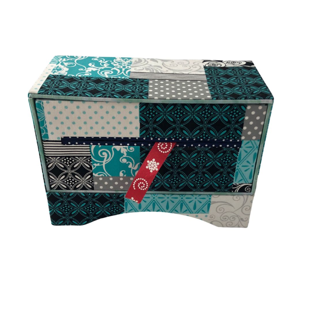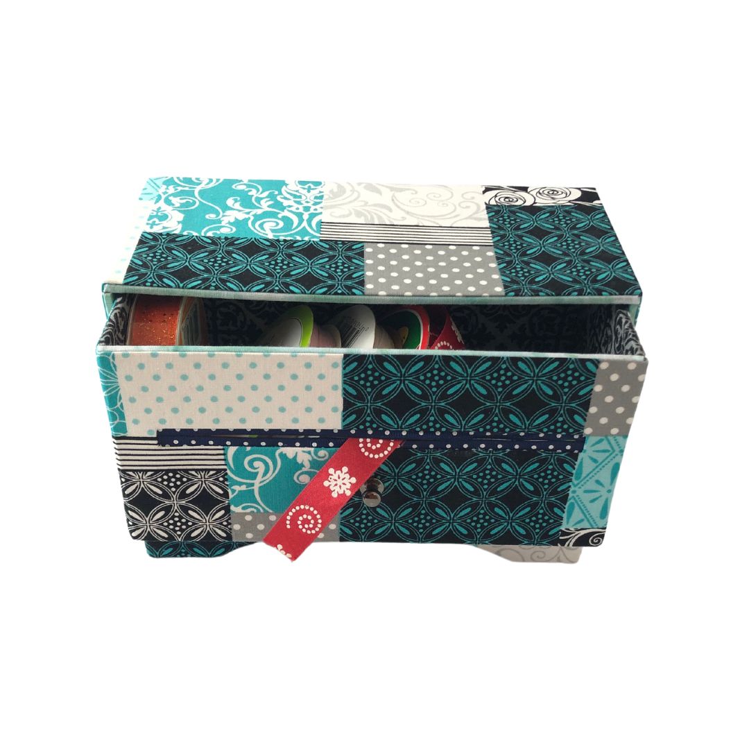 Perfect for crafters, this handmade fabric-covered ribbon organizer box brings style and functionality to your craft room. Designed with a sleek open drawer insert, it allows you to neatly store and dispense up to 12 small ribbon rolls. Simply thread the ribbons through the front slot for easy access and tangle-free use.