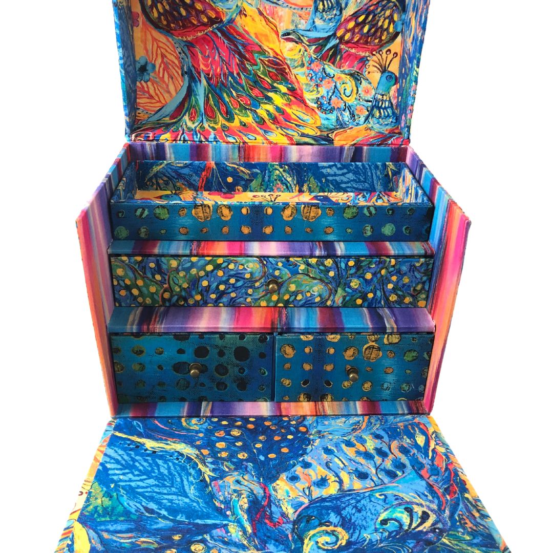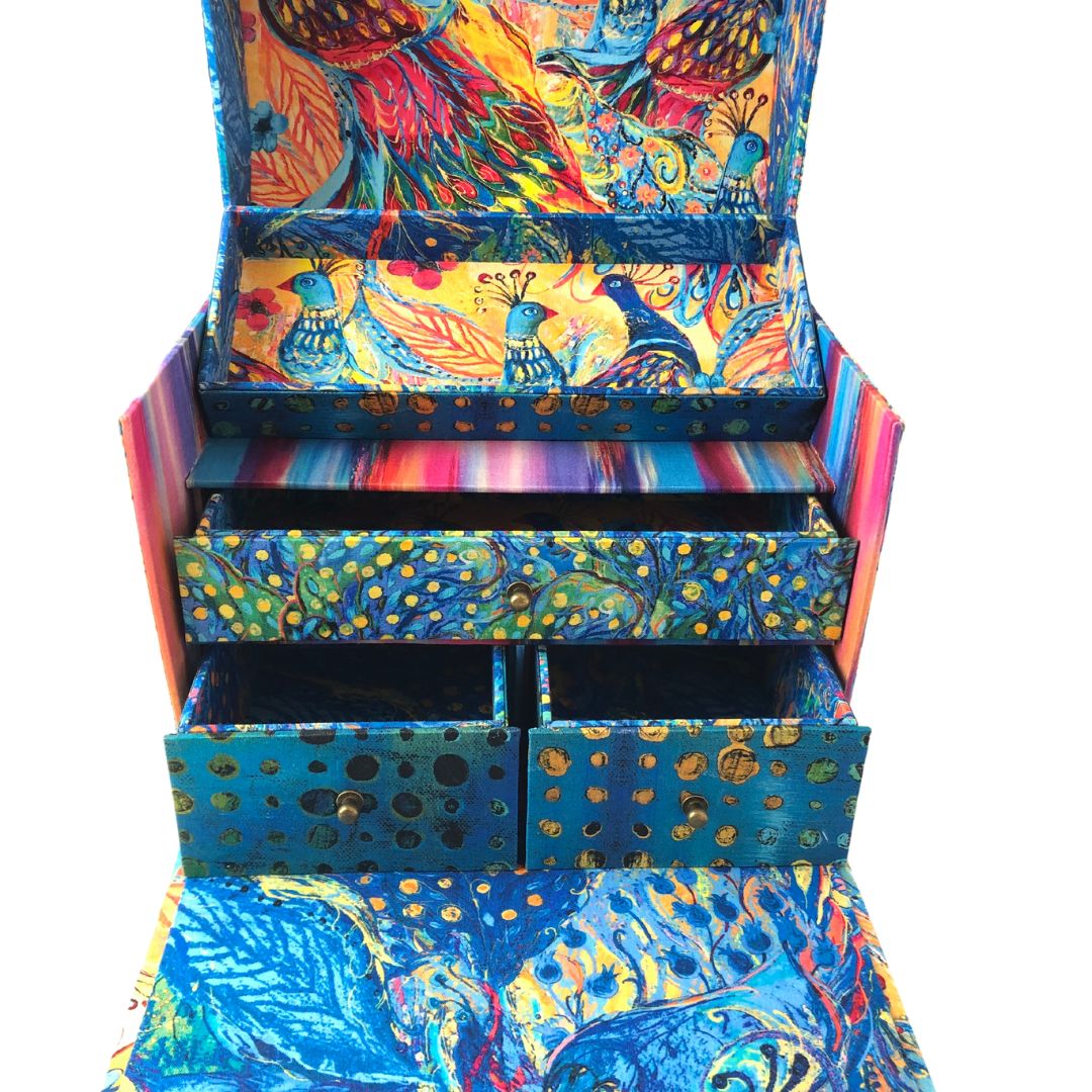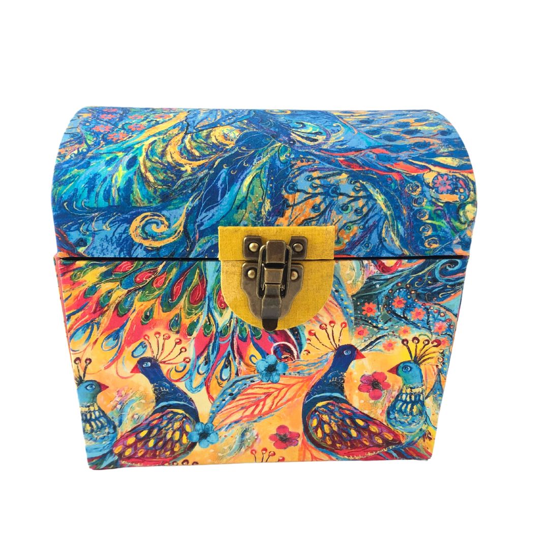 Unveil the beauty and functionality of the Wonder Chest, a stunning handcrafted organizer designed to bring charm and practicality to your space. When closed, this chest showcases an eye-catching peacock design with vibrant colors, floral motifs, and an elegant latch to keep everything secure. It’s a piece of art in itself!
